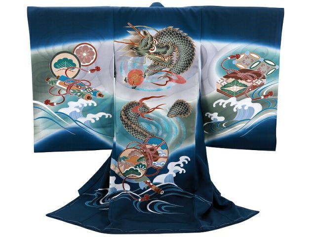 お宮参り 着物 金加工 ラメ入り 長襦袢 セット 男児 男の子 子供 産着 祝着 紺地 龍 鼓 波 ud-247
