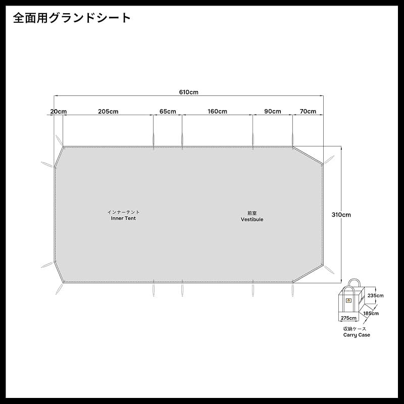 【全面用グランドシート】インナーテント用と前室部分を覆える特殊形状となっており、荷物を置きとしても便利な形状です。