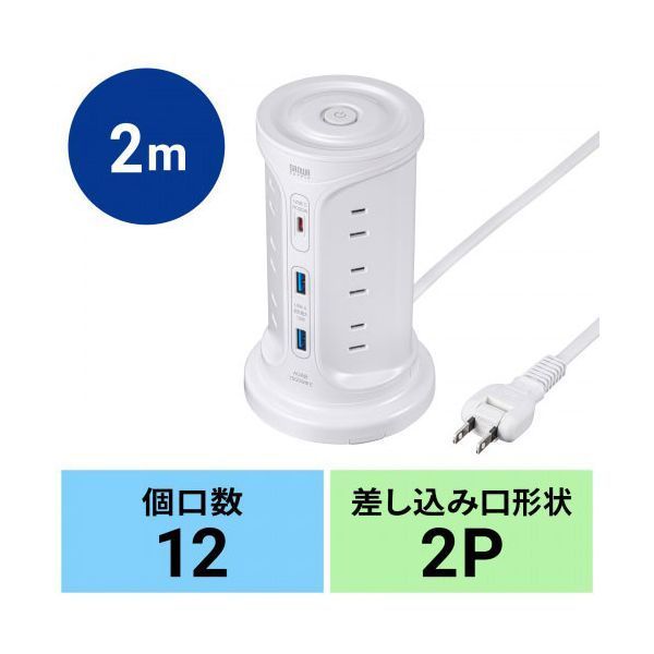 サンワサプライ USB充電機能付きタワー型タップ ホワイト TAP-
