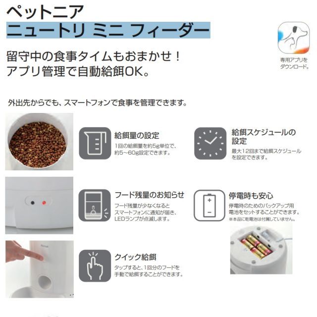 商品名:ペット 電化製品 リッチェル 犬 猫 自動給餌器 ペットニア ニュートリ ミニ フィーダー スマホと連動 アプリ 留守時もアプリから!新商品 小型家電