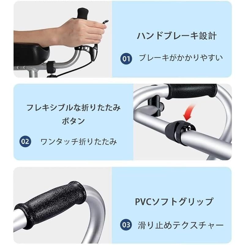 【多機能歩行補助器具】背中の問題、痛み、脊柱側弯症を抱えている人にとって、腰を屈めずに直立歩行するのは素晴らしいアイデアです。この歩行補助器は両腕支持パッドを采用し、人間工学に基づいて設計され、体のバランスをよりよく保つことができ、優れた快適さを提供します。設計を反転することができるクッションの座席を備えて、いつでもどこでもリラックスできるシートを用意します。補助歩行器は高齢者や負傷者が柔軟に、楽に歩行し、運動するのを助けます。 【フレキシブルホイールと二重安全ブレーキシステム】360°回転する前輪は、より優れた操作性を提供し、フットブレーキを備えています。后輪にはハンドブレーキシステムが接続され、安全な駐車を確保し、より大きな柔軟性を与えます。補助歩行器は、様々な地形をスムーズに移動して、さらにリラックスしたウォーキング体験を提供します。 【ワンタッチ折りたたみ式&持ち運びに便利】アームのプッシュボタンを押すだけで数秒で折りたためるので、持ち運びやコンパクトに収納が簡単です。車やショッピングカートなどにも簡単に収納できます。また、人々が外出したり買い物をする時、取り外し可能な手提げ袋は日常の保存に便利です。 【調節可能な高さ】歩行補助器の全体の高さは、さまざまな身長の人に合うように5つの位置で調整できます。 身長140?185cmの高齢者や身体の不自由な方に適しています。歩行補助器は両腕支持パッドを采用し、人間工学に基づいて設計され、体のバランスをよりよく保つことができ、優れた快適さを提供します。 【頑丈なフレームと高負荷能力】このホイールウォーカーは、高齢者向けの軽量歩行器です。また、H字型のアルミフレームは、この歩行器に特別な頑丈さと高強度を提供します。 シートの下の頑丈な金属製のチューブとクロスビームは、最大136kgまで耐えることができます。