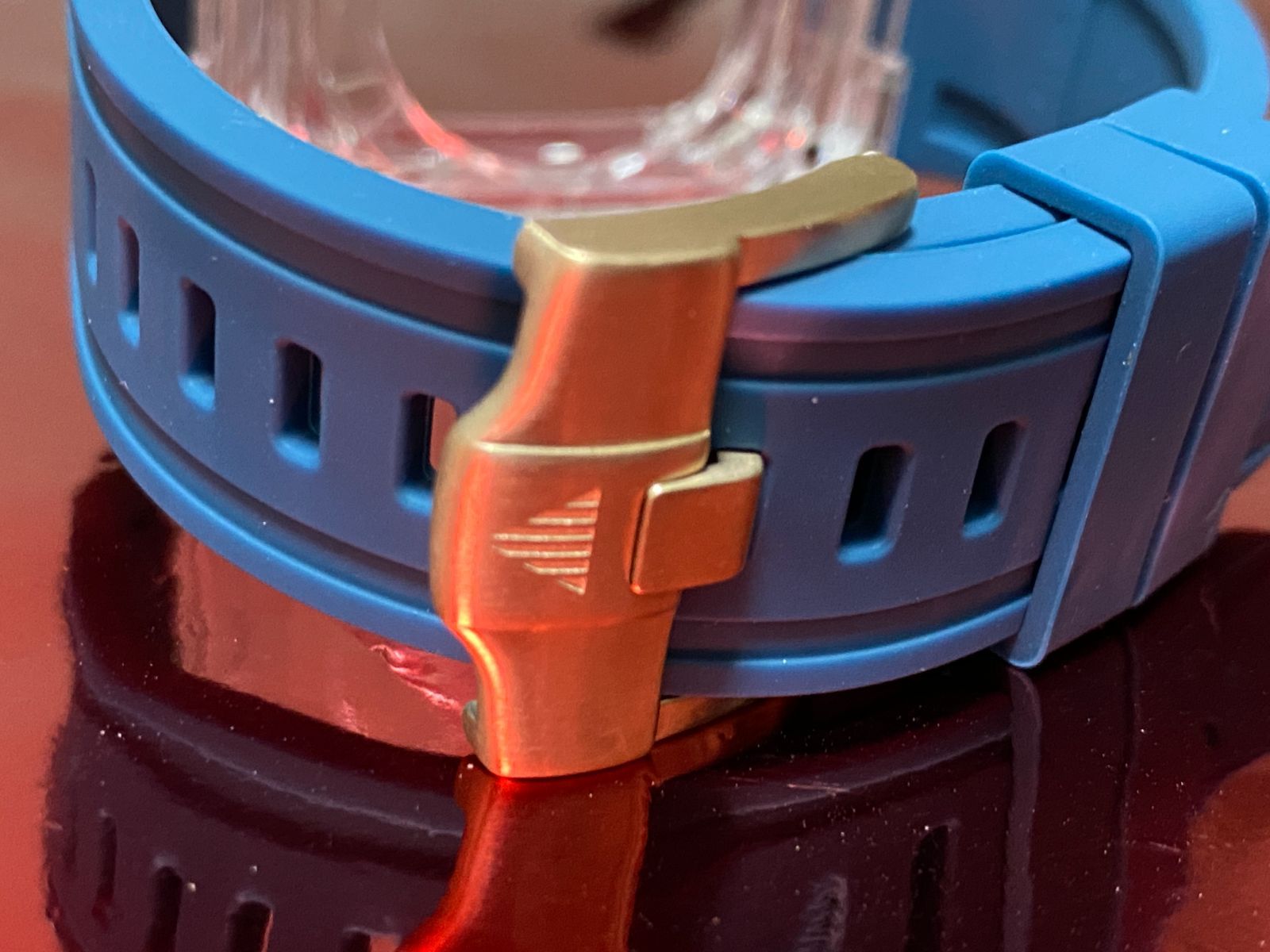 ダイヤルにはワンポイントジルコニアが装飾され、ラバーは柔らかくバックルはダイヤモンドメタルカット。