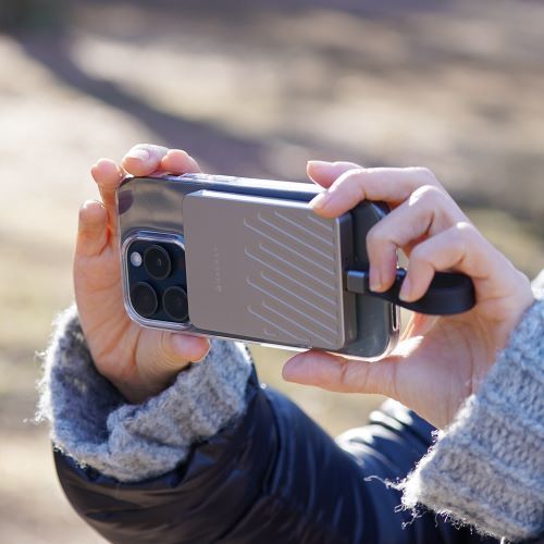 ・1cmの超スリムデザインは、iPhoneに完璧にフィットします。高品質なアルミ素材を使用したボディの表面には斜めの凹凸ラインが施されており、グリップ感を高めています。動きながらの撮影でも落下の心配がなく、安定して使用できる設計です
