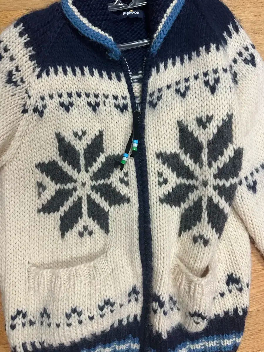 スノウプレイグがが入ったノルディックパータンのジップアップカーディガンです