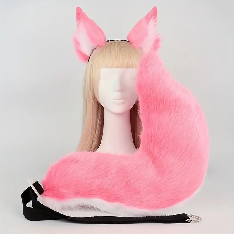 ハロウィーン 仮装 パーティー ピンク フォックス コススーツ ドレスアップ イヤー シミュレーション プラッシュ フラッフィー ビッグ フォックステール