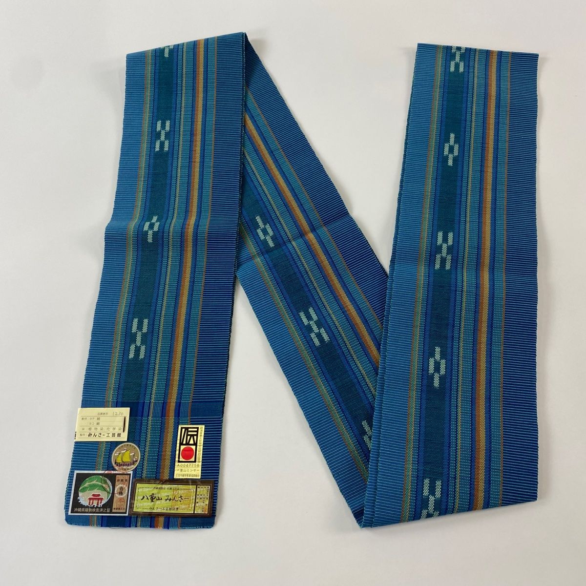 半幅帯 八重山みんさー 証紙 縞 幾何学模様 青緑 綿