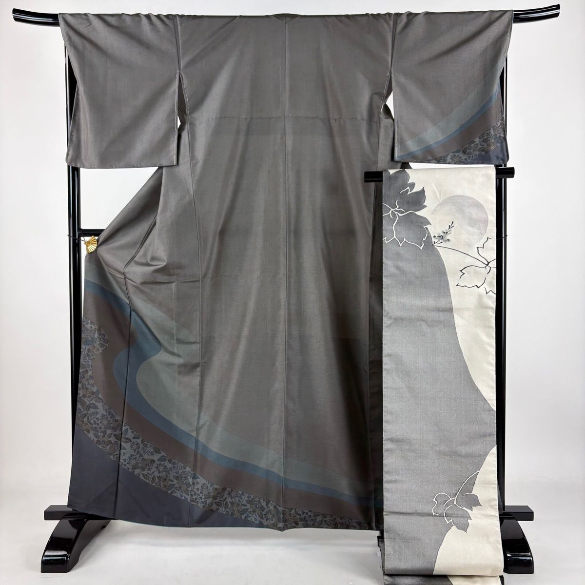 付下げ 身丈161.5 cm 裄丈69 L 袷 袋帯セット 紬地 霞 草花 金彩 灰色 正絹 秀品