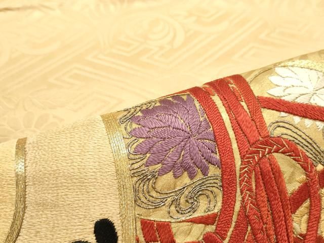 平和屋着物 アンティーク 大正ロマン 丸帯 絞り 駒刺繍 檜扇花鼓文 金糸 正絹 ob