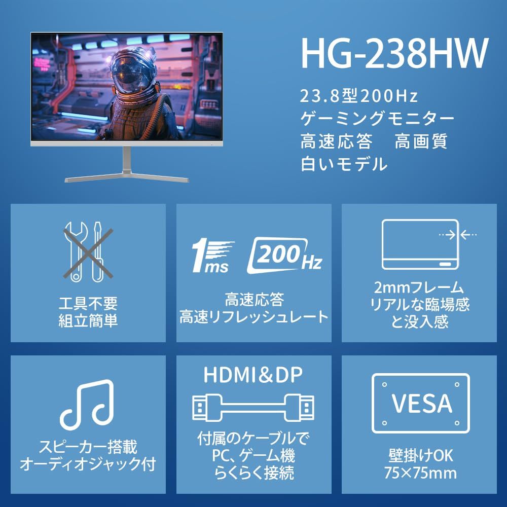 cocopar モニター 23.8インチ 白 HDMI2つ 200Hz 無輝点 120%sRGB広色域 350nit高輝度 1ms応答 1080p 非光沢IPSパネル VESA対応 角度調整 HDMI2.0 DP1.4 ゲーミングモニター FreeSync/HDR/チルト/イヤホンジャック/スピーカー ホワイト 180Hz/165Hz/144Hz/120Hz対応 HG-238HW