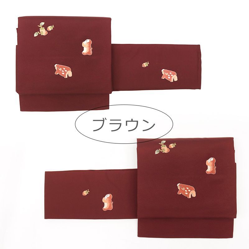 深みのある赤茶の地に、柿の実と猿、イノシシがあしらわれた遊び心のある帯。