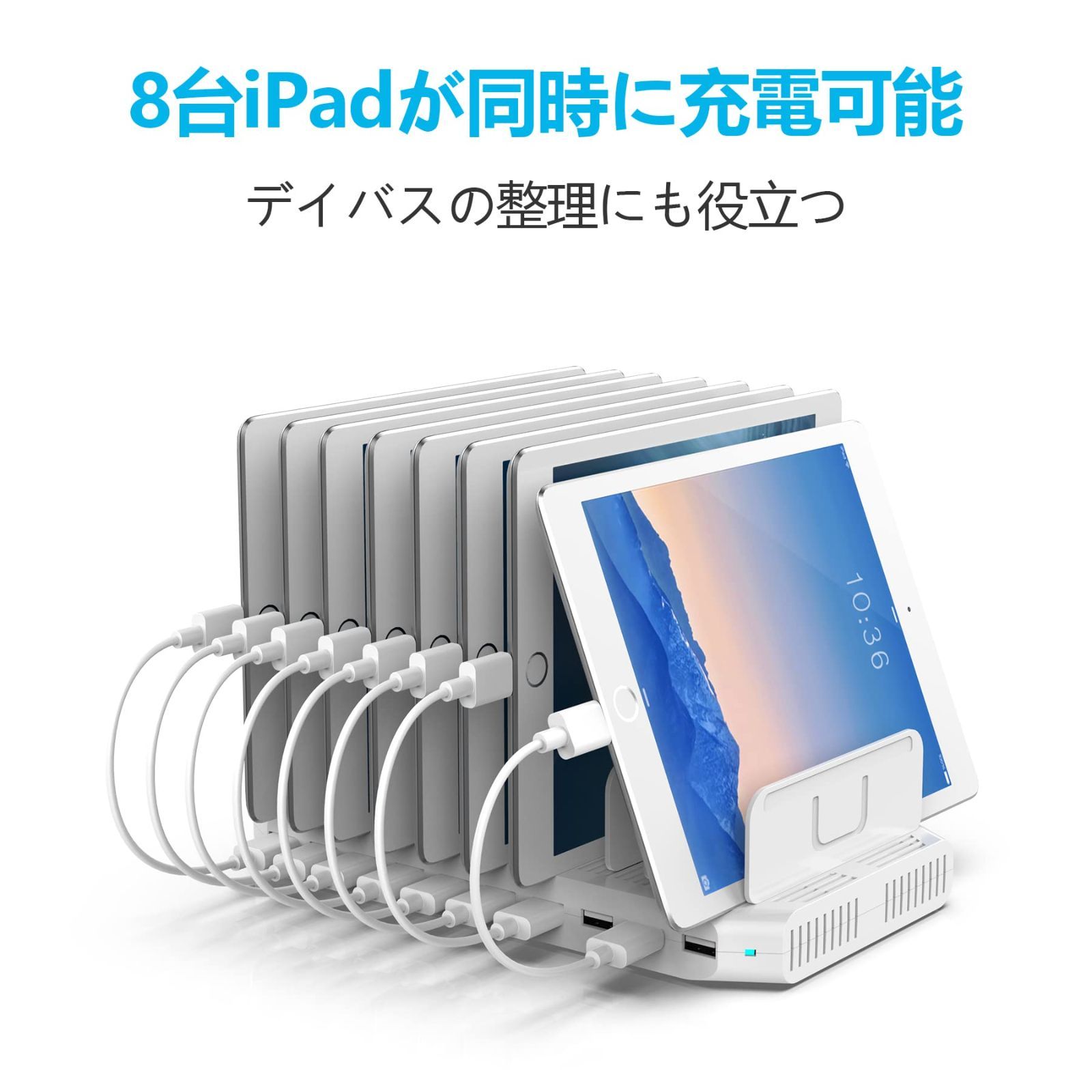 【10台同時充電タイプ】付属の仕切り板(低い板11枚)で最大10台のモバイル機器をキレイに置けます。スマートIC内蔵で充電中、USBデバイス端末に適した最適な電圧を自動的に調整できます。iPadなら最大で8台まで充電できます。