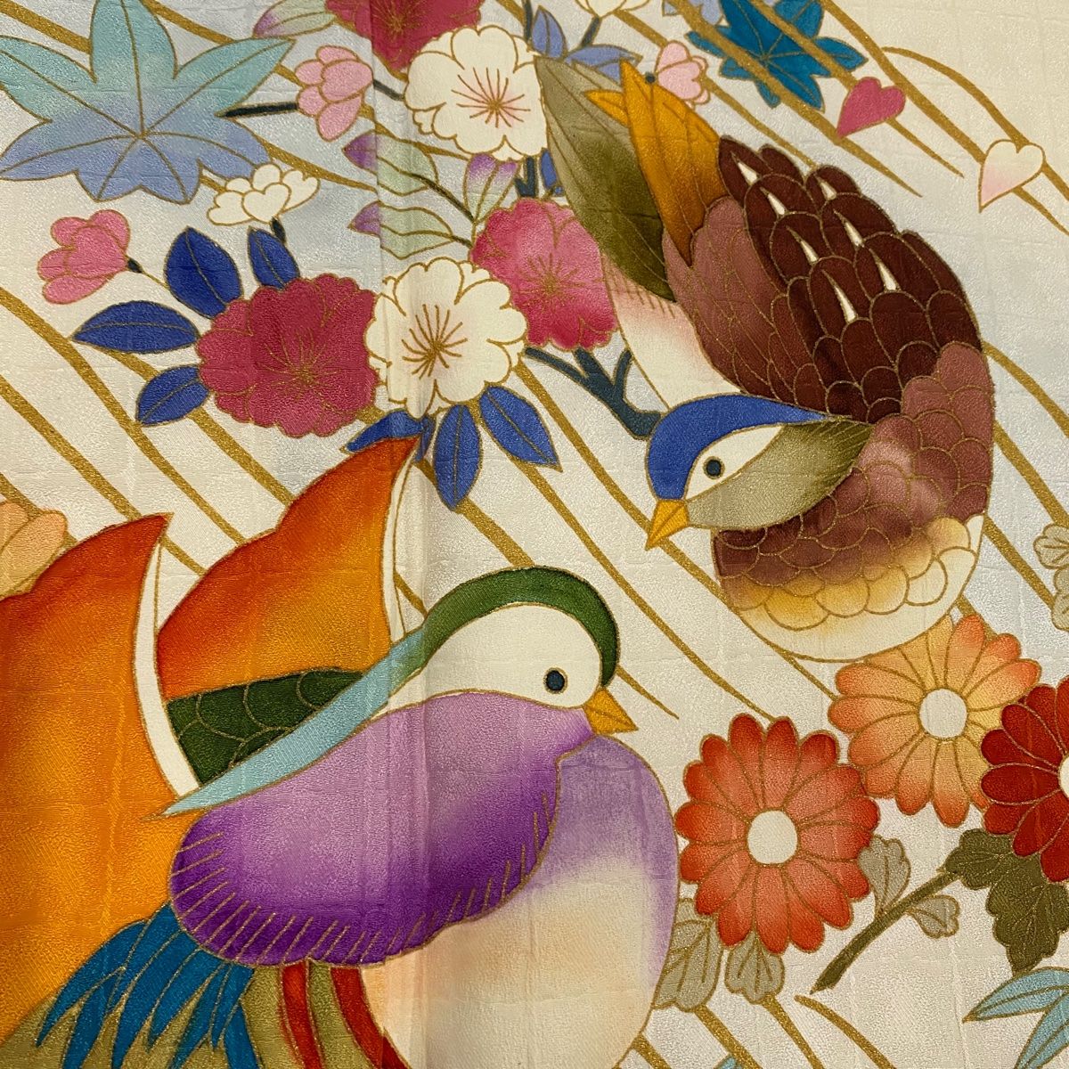 振袖 身丈160 cm 裄丈64.5 M 袷 鴛鴦 草花 金彩 ぼかし クリーム 正絹