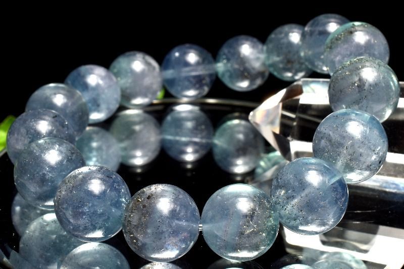 透明度の高い淡いブルーのフローライトに星々のようにキラキラ輝くパイライトが内包された幻想的で美しいブレスレットです。