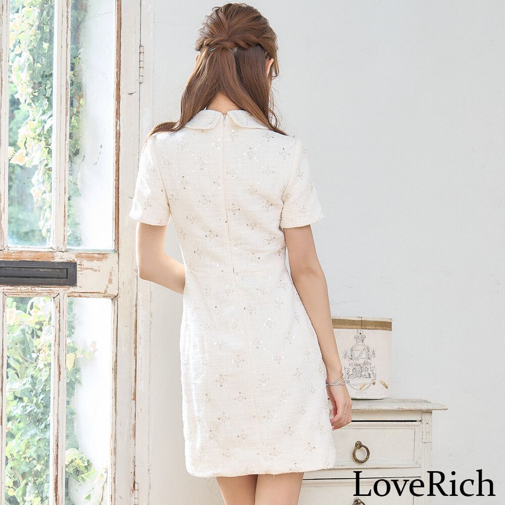 LoveRich ラブリッチ SMLサイズ|2カラー 襟付き スパンコール パールファスナー ボタン 袖あり 背中隠し 美胸 タイト ミニドレス キャバドレス 1385