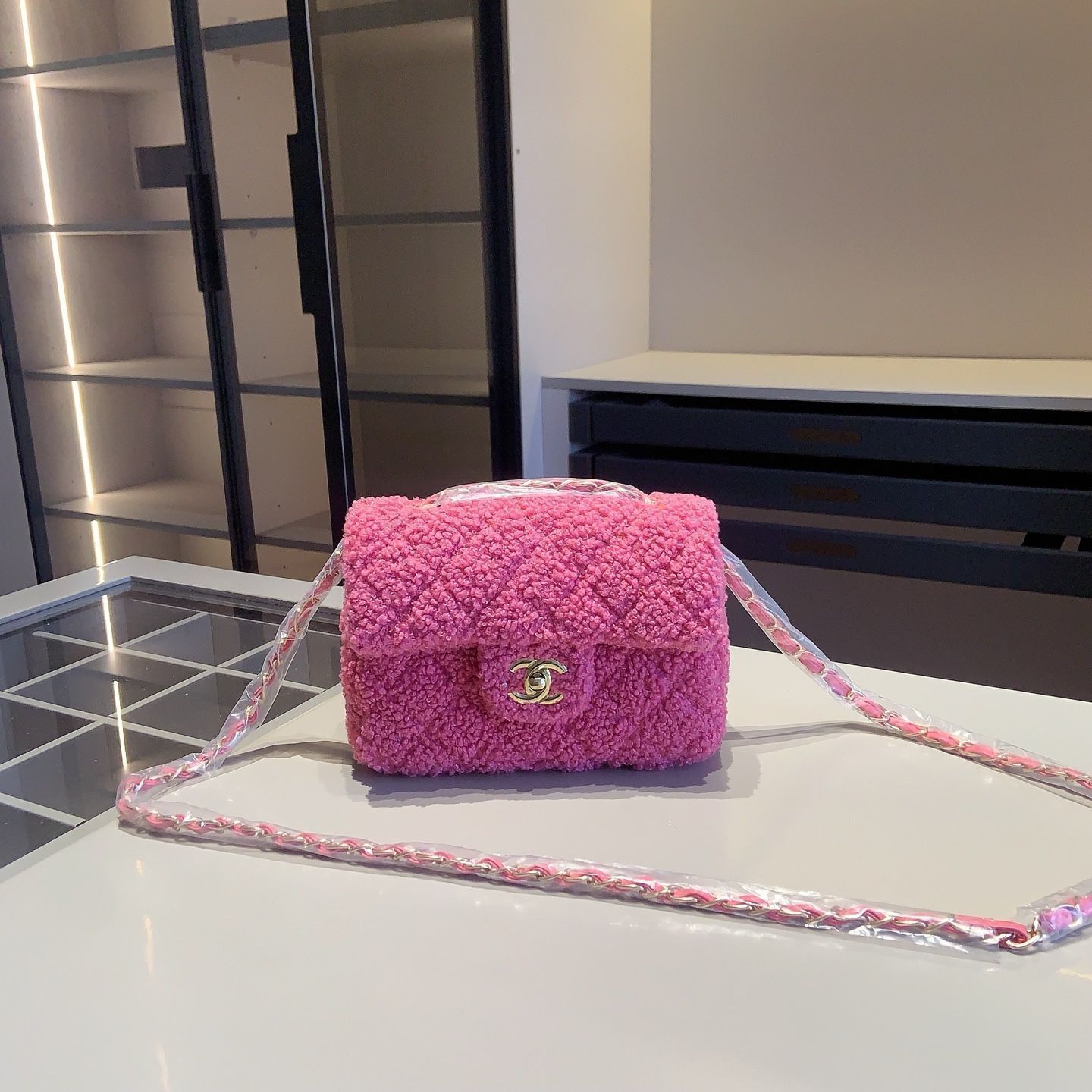 スクエアバッグは毛皮素材を使用し、チェーン付きでショルダーとしても使用可能です。スタイリッシュで実用的なデザインが魅力です。