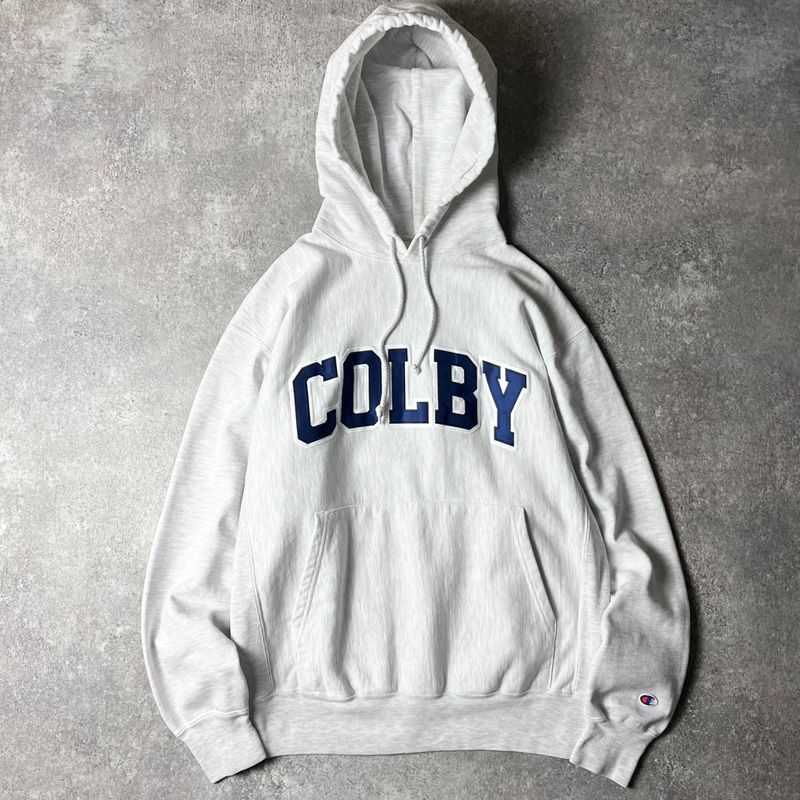 00 s Champion カレッジ パッチ 刺繍 オリジナル リバースウィーブ スウェット フード パーカー M | 00年代 オールド チャンピオン 霜降り グレー