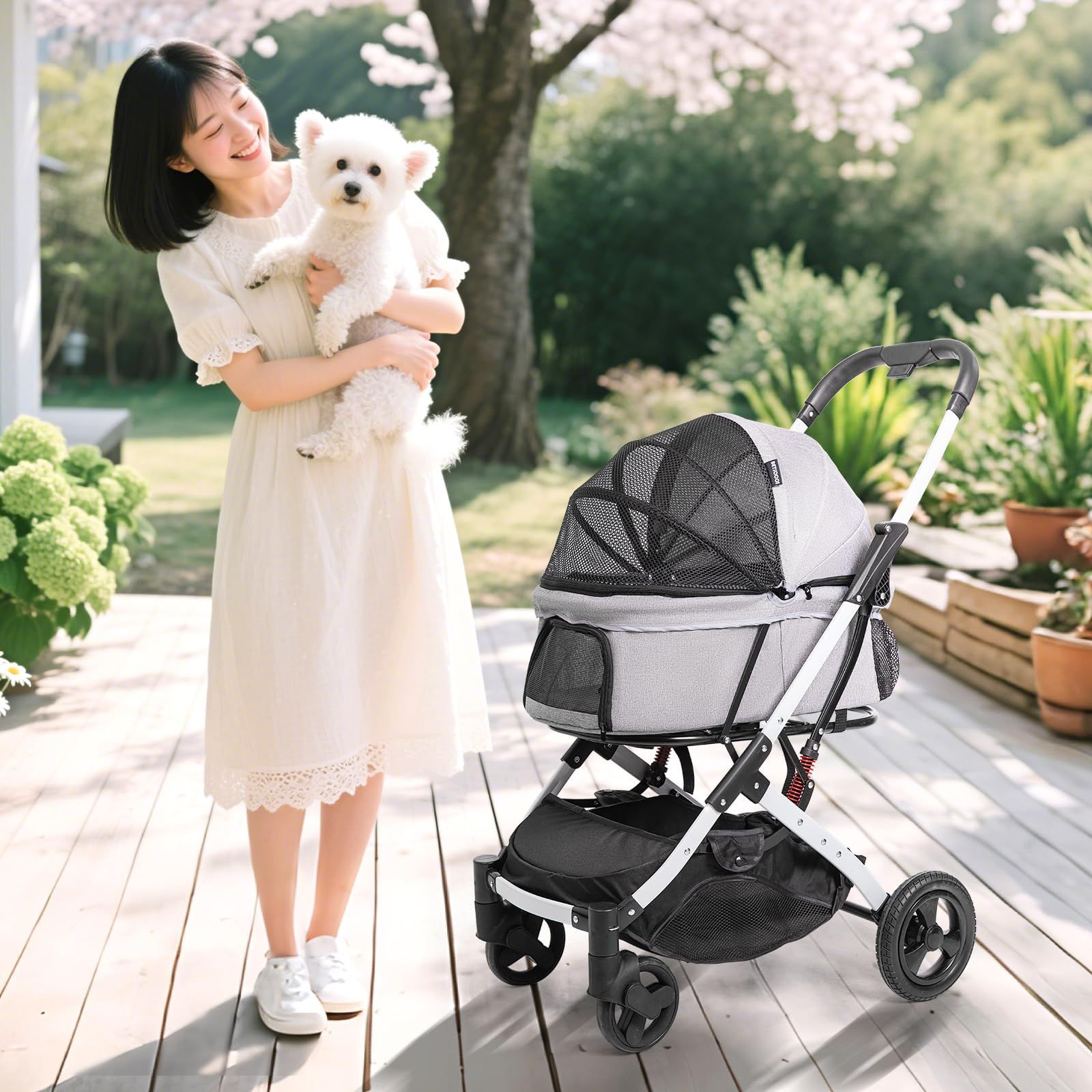 【抜群の安定性】前輪衝撃吸収システムで振動を効果的に減少し、ペットにとって快適な乗り心地を提供します。20cmの大直径後輪は障害物を軽々と越え、複雑な路面でも安定した走行を実現。また、360°回転可能な前輪は狭い場所でもスムーズに操作でき、片手で軽々と方向転換が可能です。さらに、一踏みのブレーキ設計で後輪がしっかりとロックされ、安全に停車できます。