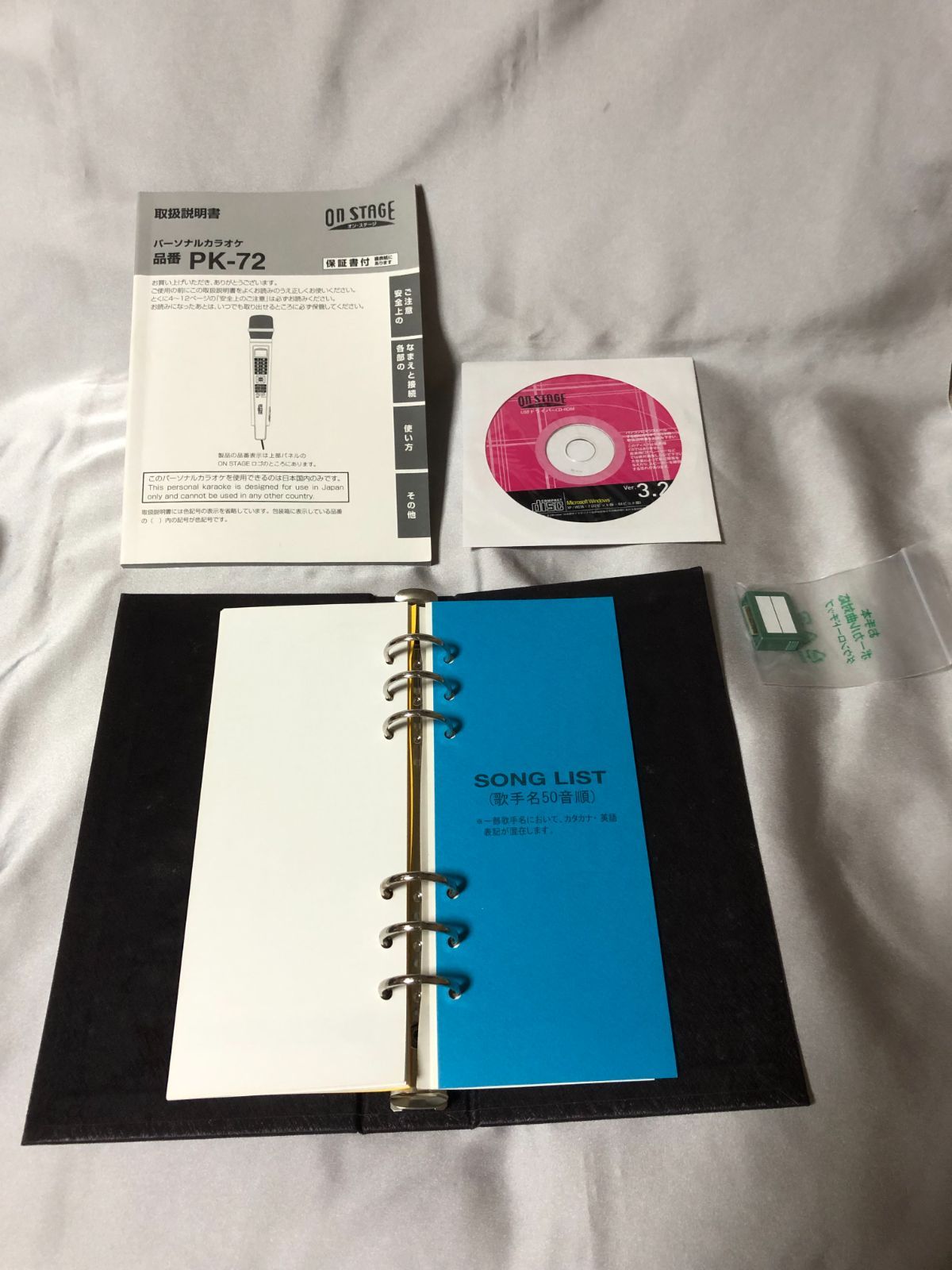 ■【動作確認済です。商品状態良好のセットです。本体には700曲内蔵されています。オン・ステージカラオケマイク、PK-72です。マイクだけで全ての操作ができます(画像3ご参照)。※ 元箱に記載の選べる20曲は権利が消滅しています。※ 元箱には傷み、破れなどあります。内部樹脂ケースは付いていません。