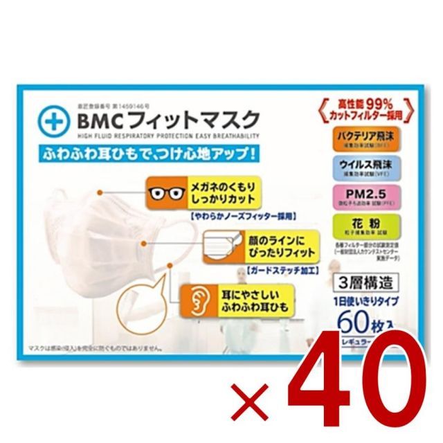 商品名:BMC フィットマスク レギュラー 60枚入 1日使い切りタイプ ビーエムシー ふつうサイズ 不織布マスク 耳が痛くなりにくい 40個