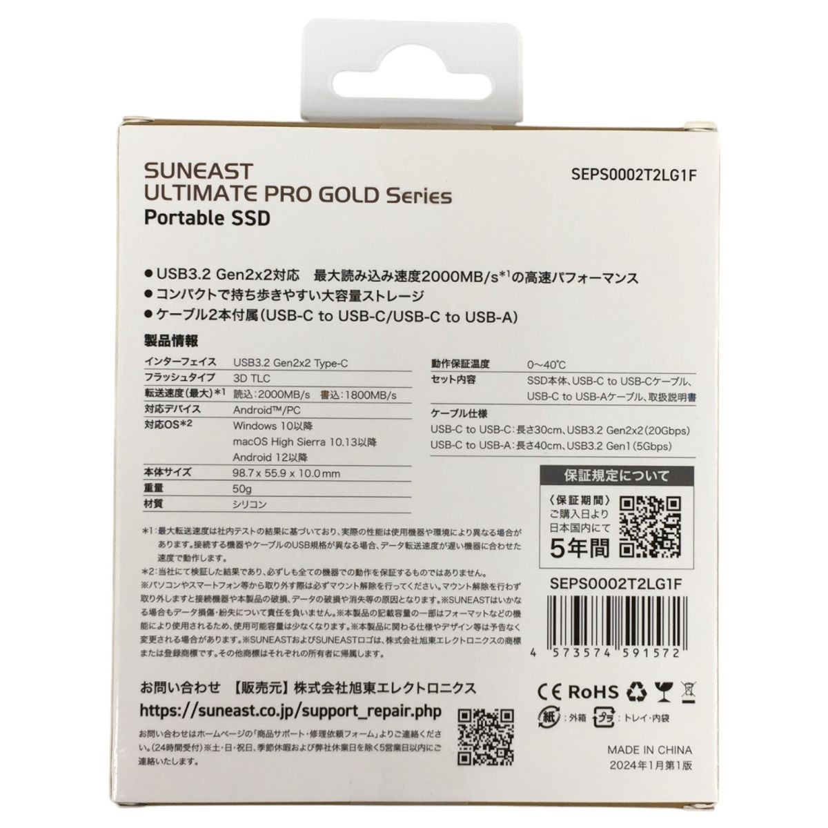 こちらは「未使用 未開封 旭東エレクトロニクス SEPS0002T2LG1F ポータブル 外付けSSD 2TB SUNEAST ULTIMATE PRO GOLD 」でございます。