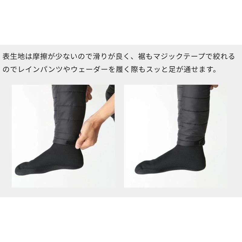 表生地は摩擦が少ないので滑りが良く、裾もマジックテープで絞れるのでレインパンツやウェーダーを履く際もスッと足が通せます。