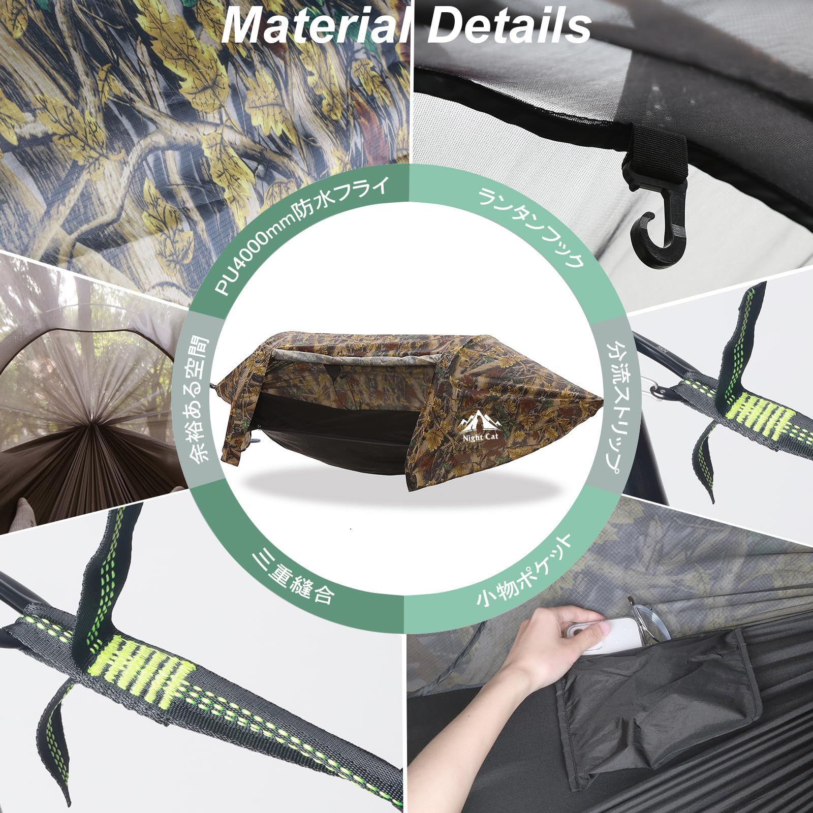 Night Cat 防水ハンモック テント 蚊帳付き フライシート付き キャンプ 軽量 簡単設営 虫対策 通気 耐水圧PU4000mm 1 2人用 耐荷重200kg 多機能 アウトドア ハイキング 庭 レジャー