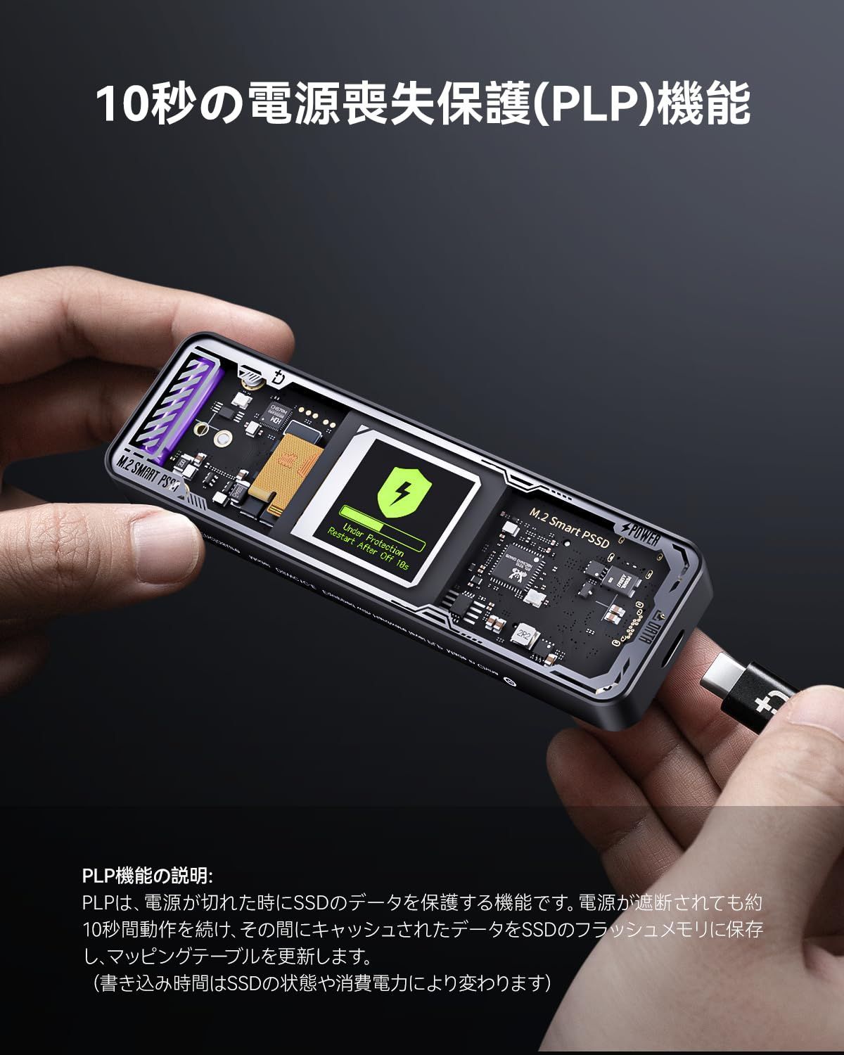 【電源喪失時の安全装置】コンデンサを使用して 10秒の「Power Loss Protection(電源保護、PLP)」に対応。不意にストレージを取り外した場合など、データ保護のため、10秒間の保護機能を装備します。