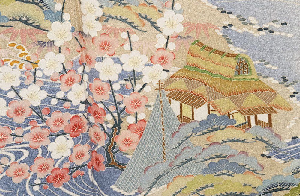本加賀友禅 吉川久仁氏作 手描き友禅 訪問着 袷 正絹 茶ベージュ 青グレー 茶屋辻 松竹梅 流水 SMサイズ ki 28963 ほうもんぎ み