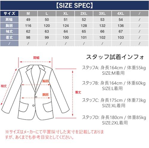 【SIZE:M】肩幅49cm 胸囲116cm 袖丈62cm 着丈98cm 【SIZE:L】肩幅50cm 胸囲120cm 袖丈63cm 着丈99cm 【SIZE:XL】肩幅51cm 胸囲124cm 袖丈64cm 着丈100cm 【SIZE:2XL】肩幅52cm 胸囲128cm 袖丈65cm 着丈101cm 【SIZE:3XL】肩幅53cm 胸囲132cm 袖丈66cm 着丈102cm 【SIZE:4XL】肩幅54cm