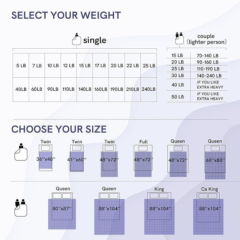 【重さの選び方】YNM加重ブランケットを選ぶとき、自分の体重の10%+1kgの重さがおすすめです。5.5kg【体重範囲 40kg~50kg】、7kg【体重範囲 50kg~70kg】、9kg【体重範囲 60kg~86kg】、11kg【体重範囲 70kg~108kg】。ブランケットサイズ:122×183cm(シングル布団)、152×203cm(シングル布団)。