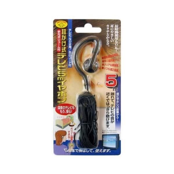 最大入力:6mW|タイプ:クリップ(インナーイヤー片耳), ステレオ/モノラル:モノラル, ノイズキャンセリング:非対応|サラウンド:非対応, ワイヤレス:非対応, インターフェース:ミニプラグ||●聞こえる音量を最大1/2まで小さくできるので従来リモコン等で行っていた音量調節が手で出来ます。 ●耳に引っ掛けるソフト素材のフック付ですのでテレビ鑑賞中に姿勢を変えたりうっかり席を立った時イヤホンが外れたり、耳の穴が小さくイヤホンが合いにくい人にも優しいフックです。 ●フックが不要の方や左耳で使用される方は、フック部分を取り外して使用が可能です。 ●材質:フック/合成ゴム、コード/軟質ビニール ●ボリューム:可変抵抗式 ●インピーダンス:22-32Ω ●周波数:20-20,000Hz ●感度:98dB/1KHz±5% ●最大入力電力:0.06W ●プラグ:3.5φモノラルミニプラグ ●コード長:5m ●質量:22g||●離れた場所でも、テレビの音が近くではっきり聞こえる|●このイヤホンを使えば、回りに迷惑をかけずにテレビの音が楽しめる|●テレビやラジオのイヤホン端子につないでご使用ください|●コードは5mの長さがあるので、離れた場所でも余裕で楽しめる|●掛けやすくて外れにくい耳掛けタイプ|●ボリューム調節がついているので、手元でボリュームの調節が簡単に行える|