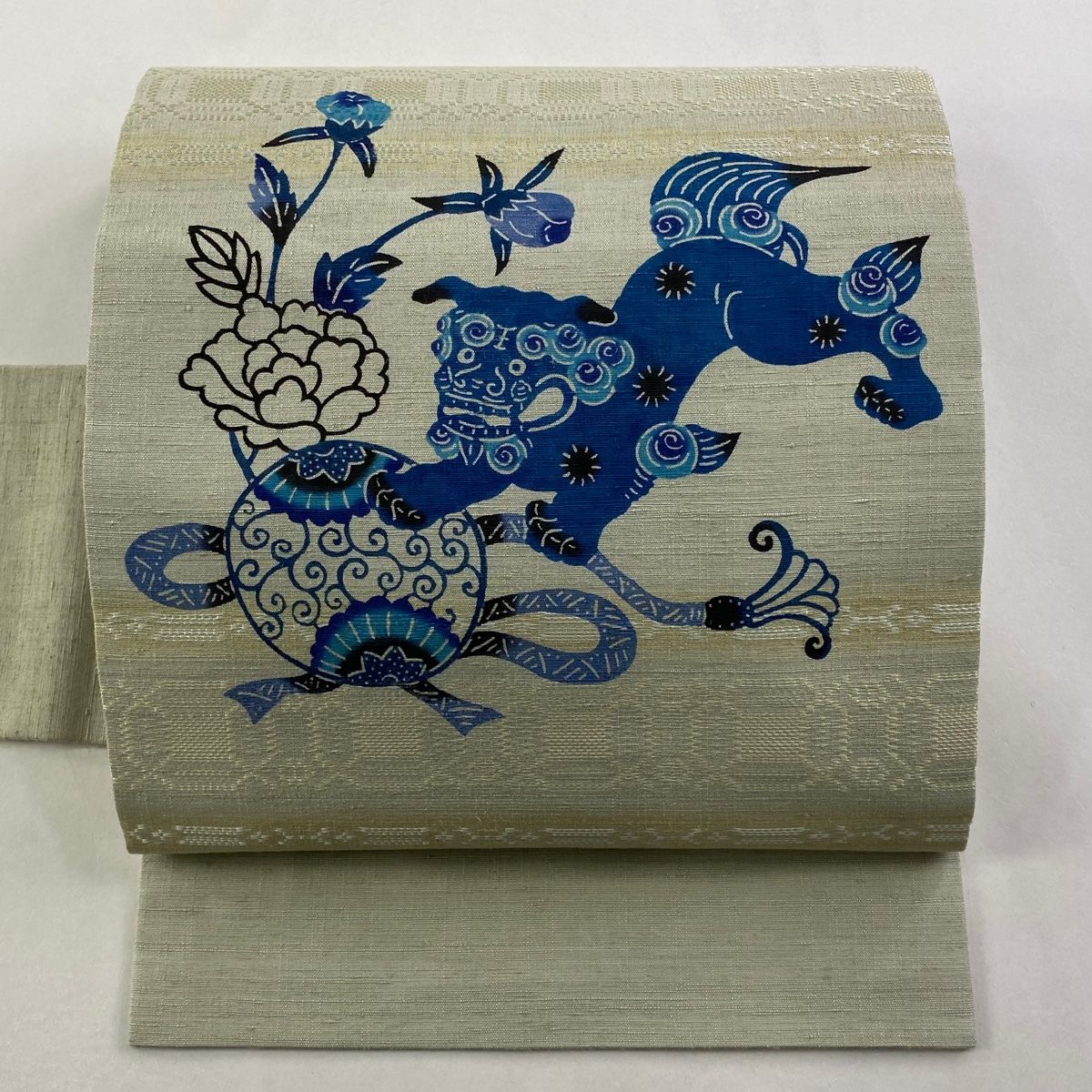名古屋帯 落款 藤崎紅型工房 藤崎眞 ますいわ屋 狛犬 鞠 琉球びんがた 薄緑 正絹