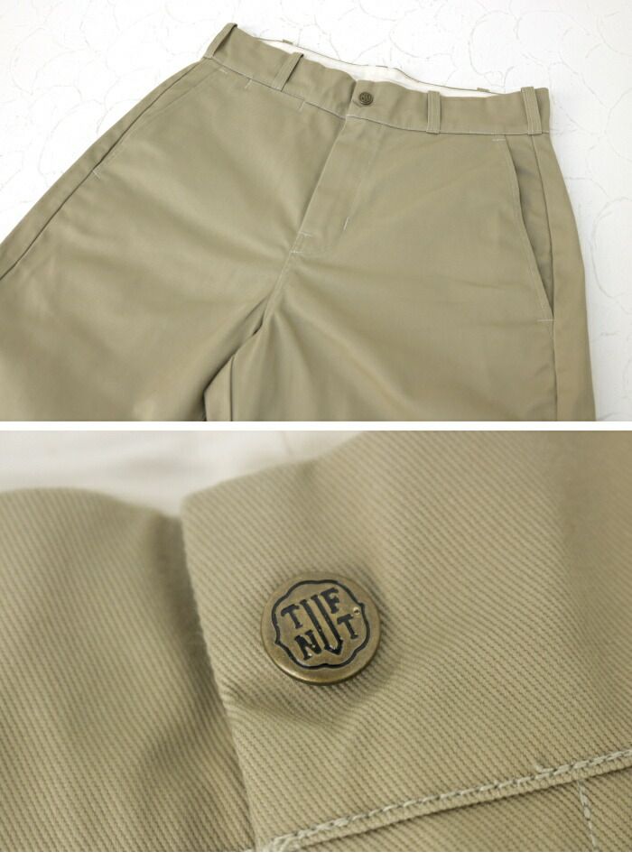 TUF-NUTのヴィンテージトラウザースは、トップボタンに尿素ボタンを使用しているものが多くみられますが、利便性を考慮してブランド名が刻印されたスナップボタンを採用しています。