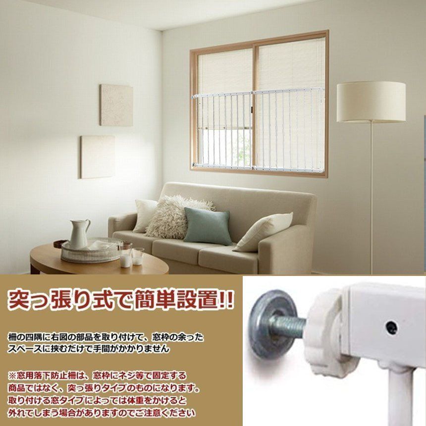 【突っ張り式で簡単設置!!】柵の四隅に右図の部品を取り付けて、窓枠の余った