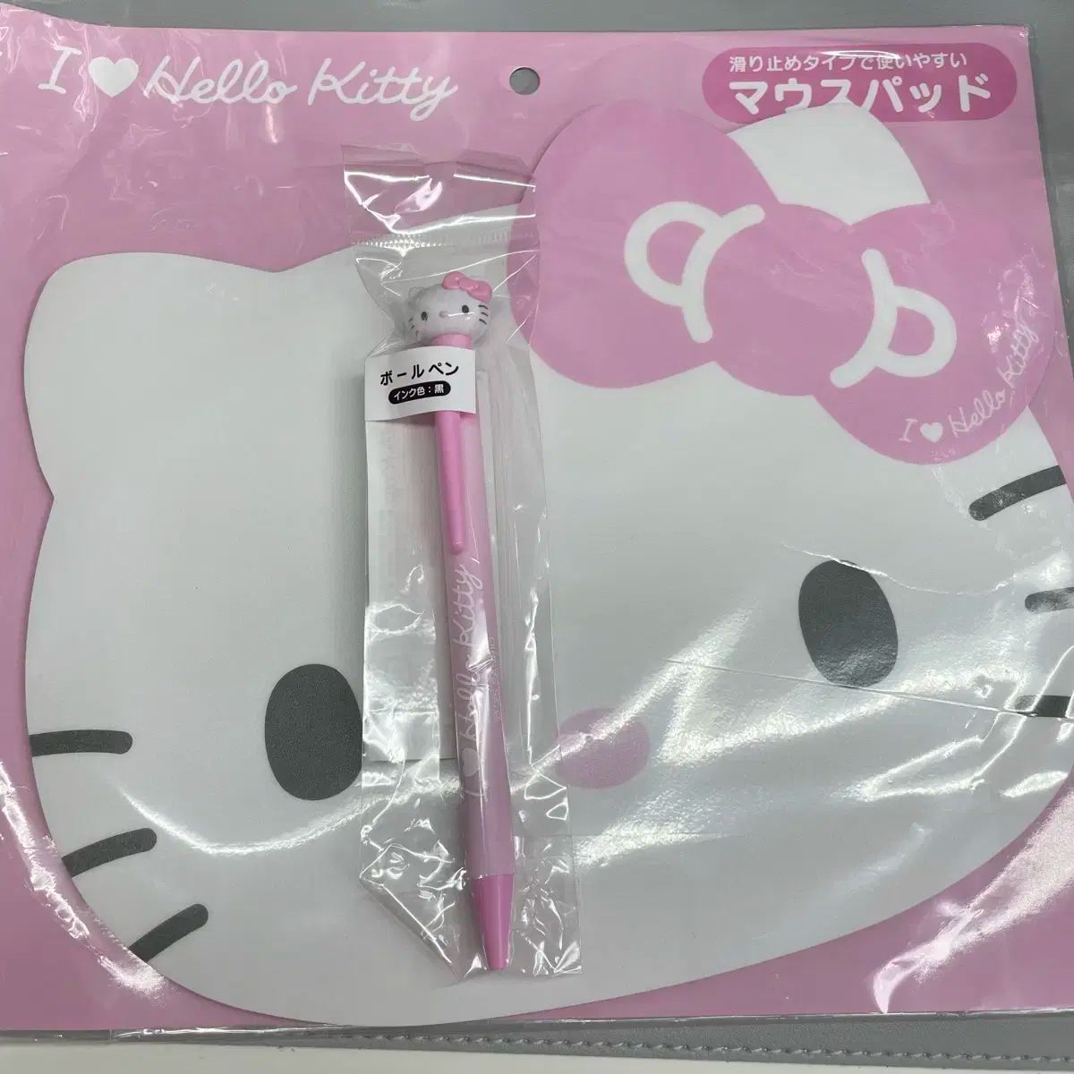 ハローキティのマウスパッドとボールペンのセットとして販売されています。新品の未開封商品で、ピンク色でとてもかわいいです。マウスパッドは滑りにくく、使いやすいです。
