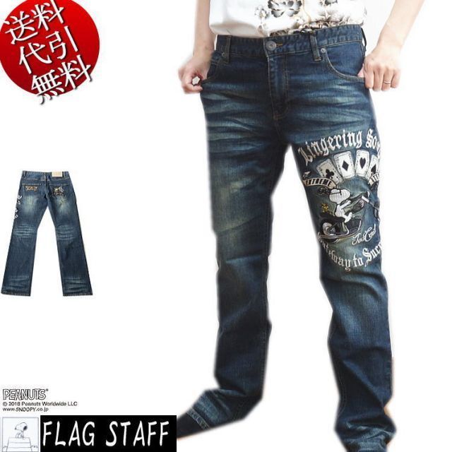 商品名:2022年夏新作【ビッグ有】FLAGSTAFF×スヌーピーコラボ【送料無料】SNOOPY刺繍 ウッドストック バイク PEANUTS ローライズストレッチデニム ジーンズ インディゴ 30〜40【smtb-k】【ky】【YDKG-k】メンズ 422230