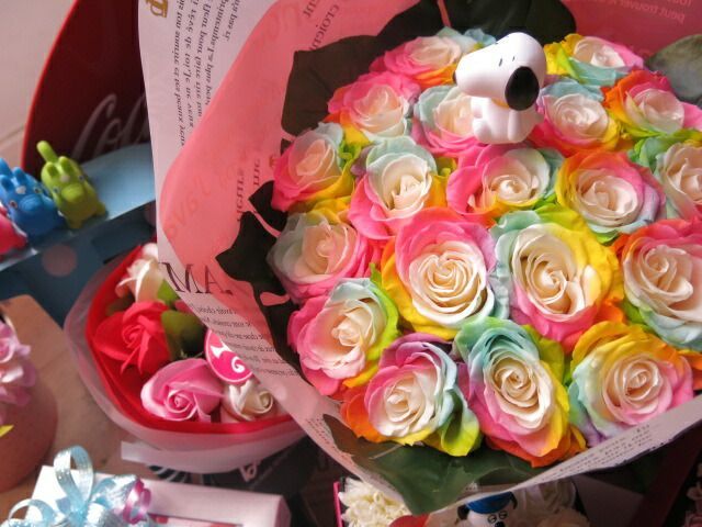 スヌーピー入り 花束 レインボーローズ プリザーブドフラワー 20本使用 スヌーピーマスコット はおまかせ 何が入るかはお楽しみに