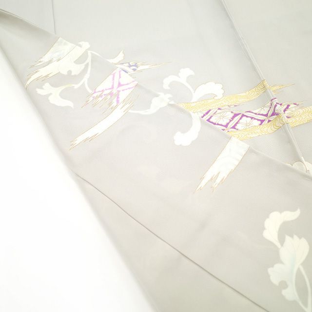 龍村美術織物 監修 訪問着 着物 未仕立て 仮絵羽 手描き友禅 正絹 金駒刺繍 金彩 ライトグレー 唐草 フォーマル 結婚式 入学式 卒業式 七五三 お茶会 販売 リサイクル みやがわ sbs 14079