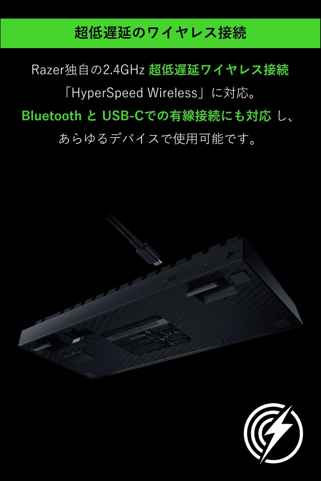 つの接続モード - Razer HyperSpeed (ワイヤレス 2.4 GHz)、Bluetooth、USB】 低レイテンシーのワイヤレスゲーミングと