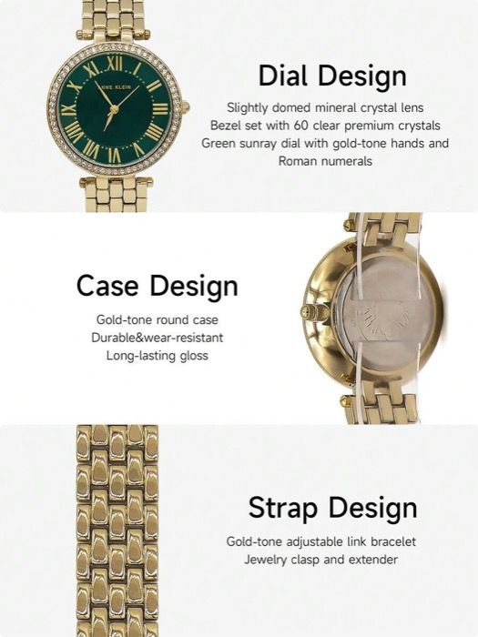 腕時計 レディース クォーツ クリスタルアクセント ゴールドトーン ブレスレットウォッチ グリーンサンレイダイヤルウォッチ 調節 リンクブレスレット 防水クォーツウォッチ