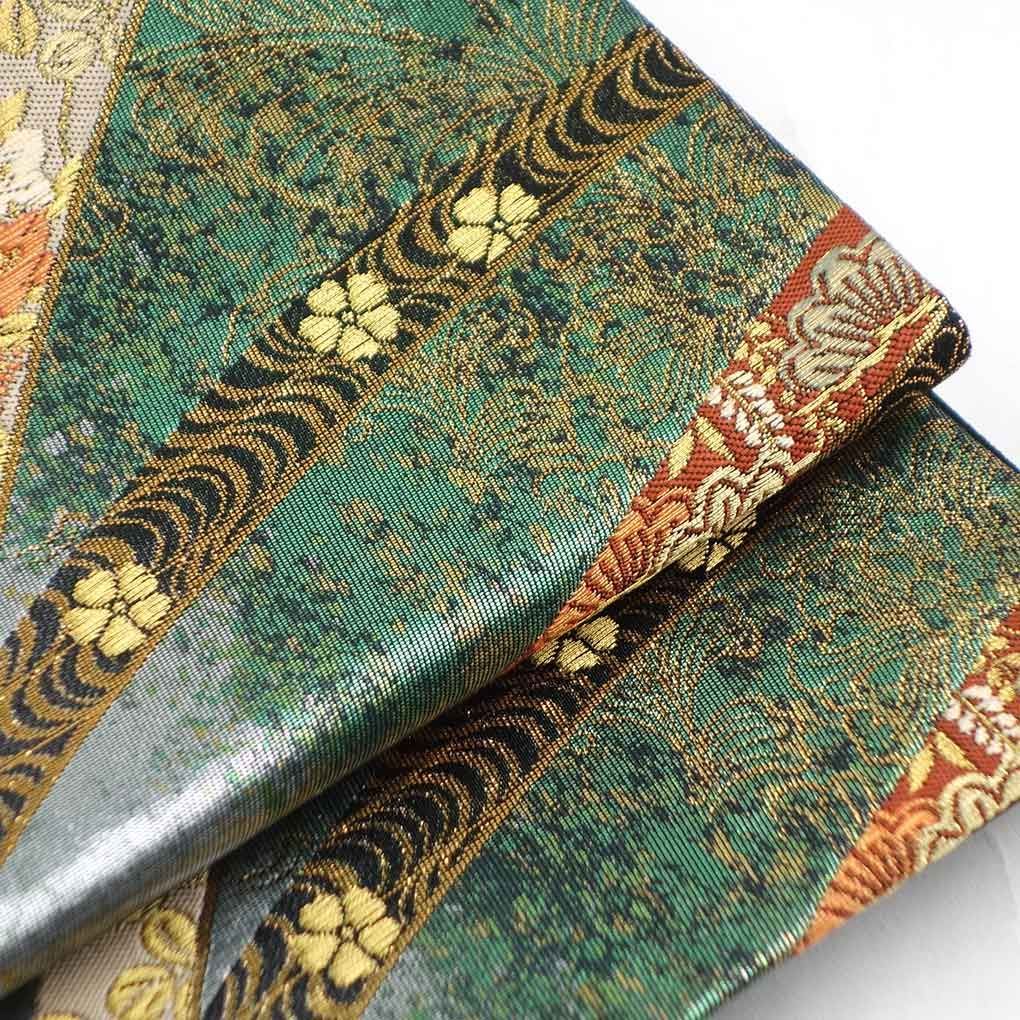 正絹の六通柄の袋帯です。銀糸とグリーンの箔の縦ぼかしに連続模様で留袖や訪問着などフォーマル用途の着物に合わせてお使いいただけます。