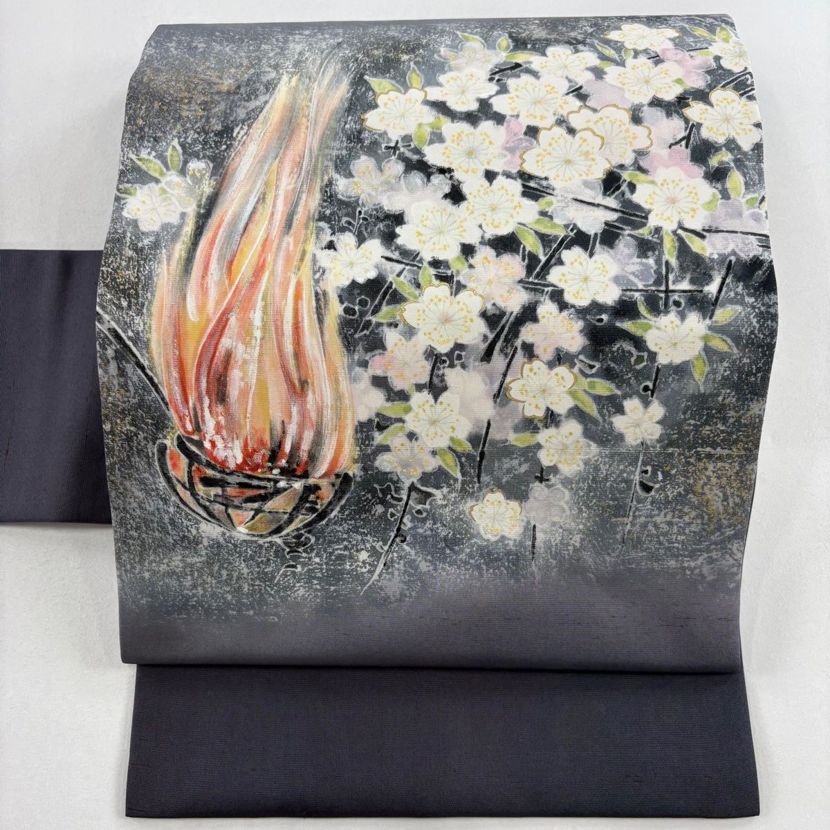 名古屋帯 紬地 桜 かがり火 金銀彩 ぼかし 灰紫 正絹