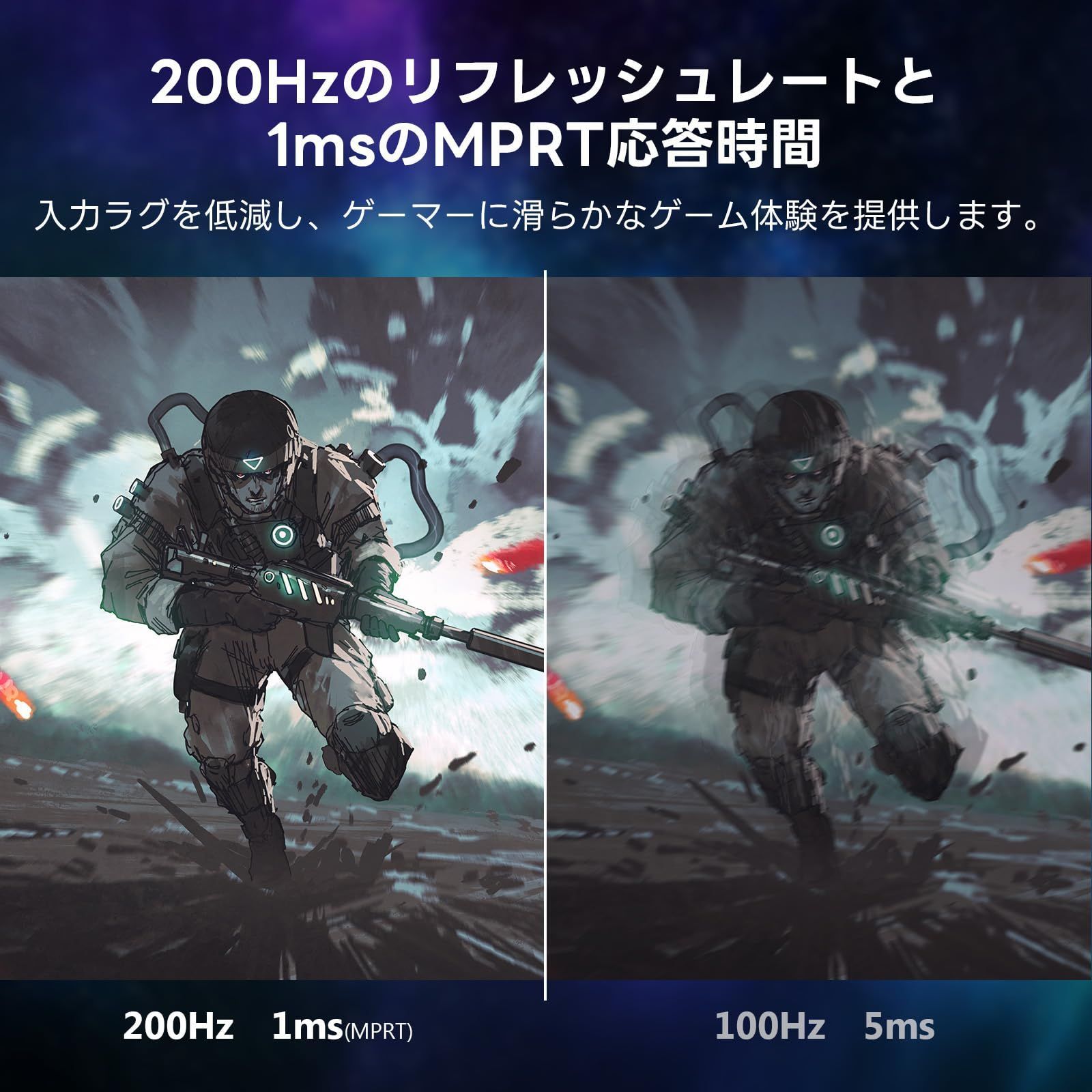 【最高の表示速度】200Hz、ゲームで激しい動きでも残像が少なく見やすい 高速であり、幅広いゲームをなめらかで残像感のない映像で満喫することができます。