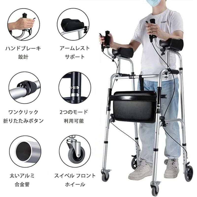 【多機能歩行補助器具】背中の問題、痛み、脊柱側弯症を抱えている人にとって、腰を屈めずに直立歩行するのは素晴らしいアイデアです。この歩行補助器は両腕支持パッドを采用し、人間工学に基づいて設計され、体のバランスをよりよく保つことができ、優れた快適さを提供します。設計を反転することができるクッションの座席を備えて、いつでもどこでもリラックスできるシートを用意します。補助歩行器は高齢者や負傷者が柔軟に、楽に歩行し、運動するのを助けます。 【フレキシブルホイールと二重安全ブレーキシステム】360°回転する前輪は、より優れた操作性を提供し、フットブレーキを備えています。后輪にはハンドブレーキシステムが接続され、安全な駐車を確保し、より大きな柔軟性を与えます。補助歩行器は、様々な地形をスムーズに移動して、さらにリラックスしたウォーキング体験を提供します。 【ワンタッチ折りたたみ式&持ち運びに便利】アームのプッシュボタンを押すだけで数秒で折りたためるので、持ち運びやコンパクトに収納が簡単です。車やショッピングカートなどにも簡単に収納できます。また、人々が外出したり買い物をする時、取り外し可能な手提げ袋は日常の保存に便利です。 【調節可能な高さ】歩行補助器の全体の高さは、さまざまな身長の人に合うように5つの位置で調整できます。 身長140?185cmの高齢者や身体の不自由な方に適しています。歩行補助器は両腕支持パッドを采用し、人間工学に基づいて設計され、体のバランスをよりよく保つことができ、優れた快適さを提供します。 【頑丈なフレームと高負荷能力】このホイールウォーカーは、高齢者向けの軽量歩行器です。また、H字型のアルミフレームは、この歩行器に特別な頑丈さと高強度を提供します。 シートの下の頑丈な金属製のチューブとクロスビームは、最大136kgまで耐えることができます。