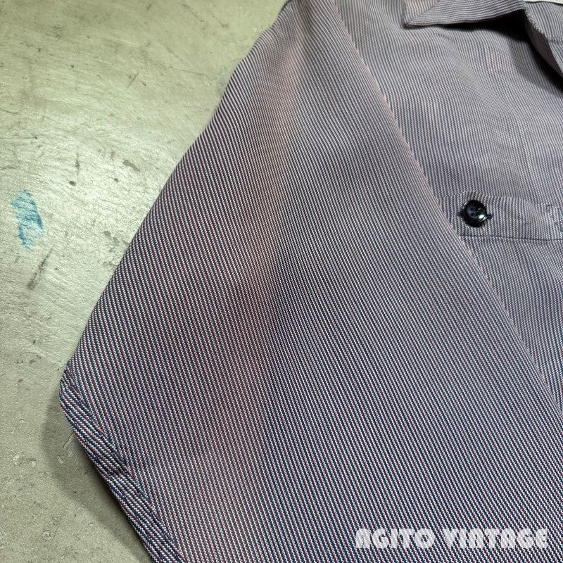 50年代頃のGordon Sportswear ピンストライプレーヨンオープンカラーシャツです。ブランド詳細は不明ですがケンタッキー州では競走馬やサラブレッドの生産が知られた州であり、タグに記載された”BRED IN KENTUCKY”はケンタッキー州で生まれた馬を表す言葉で、ケンタッキー州産を売りにして創業した衣料品メーカーだと思われます。ご紹介するこちらは襟芯の入らない袋襟で、ループボタンが付く開襟仕様のシャツです。ボタンは全て揃っており、両胸にパッチポケットが付きます。赤と青の細かいピンストライプがレーヨン生地と相まってとろみと立体感を感じる1着です。ピンストライプのおかげで目立ちにくいですがこちらも両脇に変色が見られます。袖や肩周りにヤケが見られ、左裾に小さなダメージがございます。左袖に糸抜けの様な線がが見られますがその他は特に気になる箇所はございません。Sサイズ表記です。デニムなどのワークウェアも良いですが、スラックス系で合わせていただくと相性も良いかと思います。サイズ感の合う方は是非いかがでしょうか。