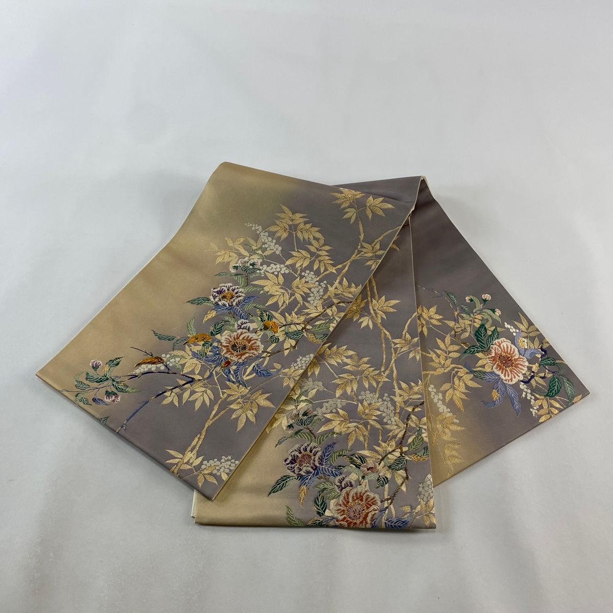 袋帯 秀品 枝花 南天 螺鈿 金糸 灰紫 お太鼓柄 正絹