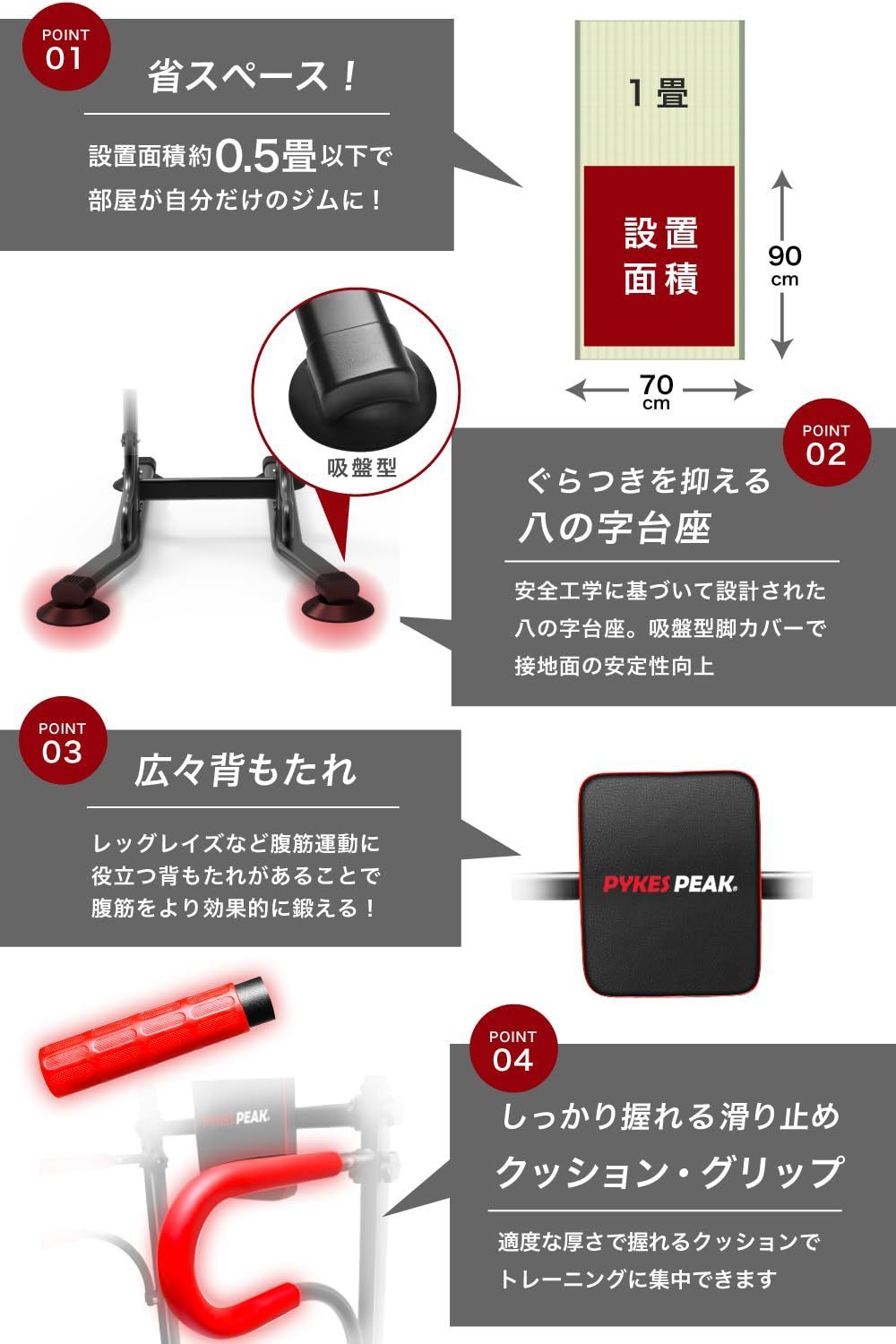 ?【製品仕様】設置面積は約70cm×約90cmで、スペースを取らずに自宅でしっかりトレーニングが可能。総重量16.5kgで、八の字型の台座と吸盤型のフットカバーが接地面での安定感を向上させ、トレーニング中のぐらつきをしっかり抑えます。カラーはオールブラックとブラックレッドの2色をご用意しており、インテリアに合わせてお選びいただけます。さらに、取扱説明書と工具が付属しているため、女性でも簡単に組み立てられ、手軽にセットアップ可能です。