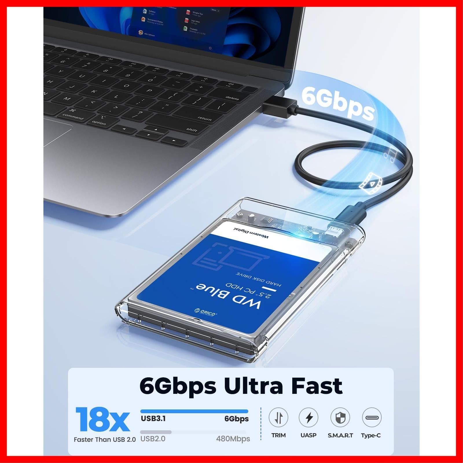 商品 SSD ケース USB C 3.1 HDD GEN 1 ドライブケース 6 Gbps転送 2.5インチ 透明 SATA 3.0 ハードディスクケース Type-C TB 9.5 mm以下 対応 静電気防止 PC材料 ORICO ポータブルHDDケース
