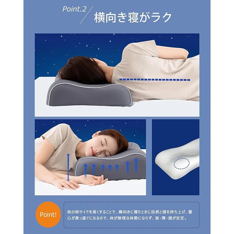 【横向き寝がラク】両サイドを高めにした安眠枕です。横向き寝時、サイドの高め部分に寝ると、自然に頭部が持ち上がり、背筋が真っ直ぐに整いますので、体に無理な負担をかけず、首・肩・頭が安定します。