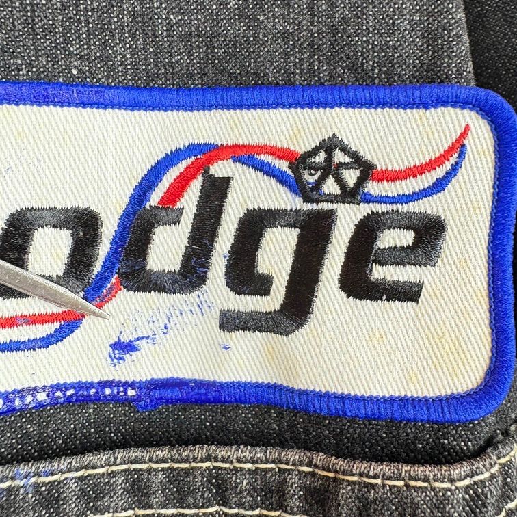 90年代らしい無骨なデニムボディに、胸元にはCarharttロゴタグとDodge(ダッジ)の刺繍ワッペンが施されたスペシャルな一着です。